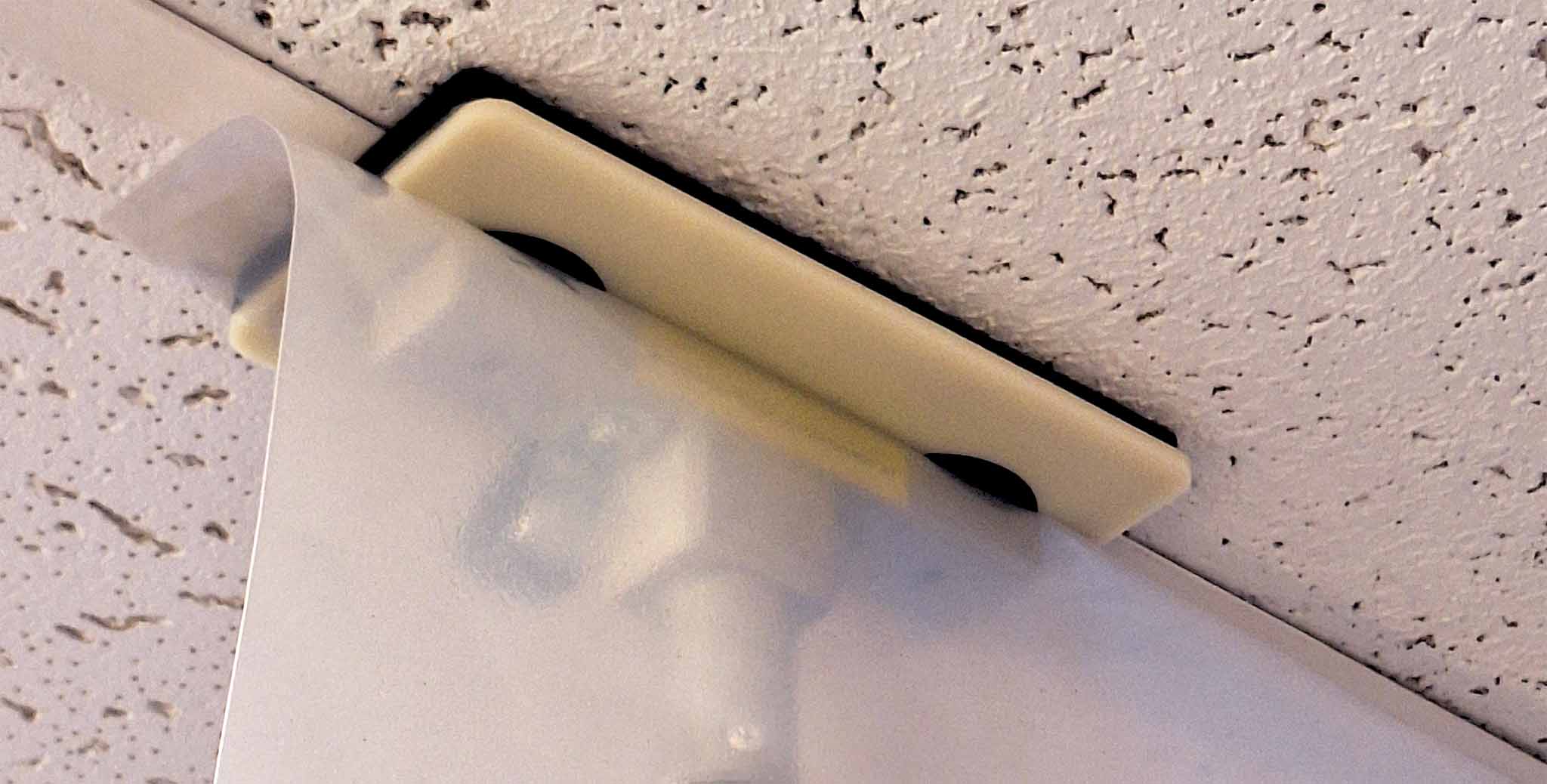 Hook and loop fastener holds cords securely for placement along T-grid or over steel cased door frames.